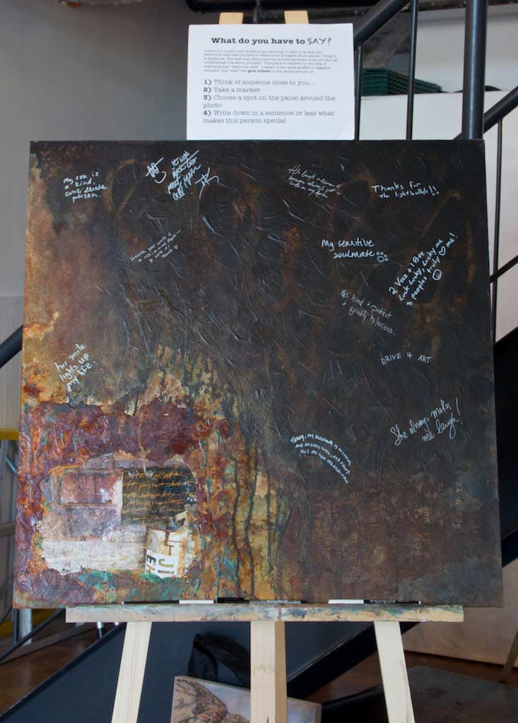 I showed an interactive art piece, pictured on the left, and asked visitors to write down messages for me to incorporate into my painting. I was inspired by the idea of rewriting the “bathroom wall”. In the past, the bathroom wall was the place to share your thoughts about other people. The wall was often a source of entertainment until you discovered an unflattering note about yourself. Instead of the usual graffiti of negative remarks, viewers have a chance to give tribute to those close to them on the “wall”.