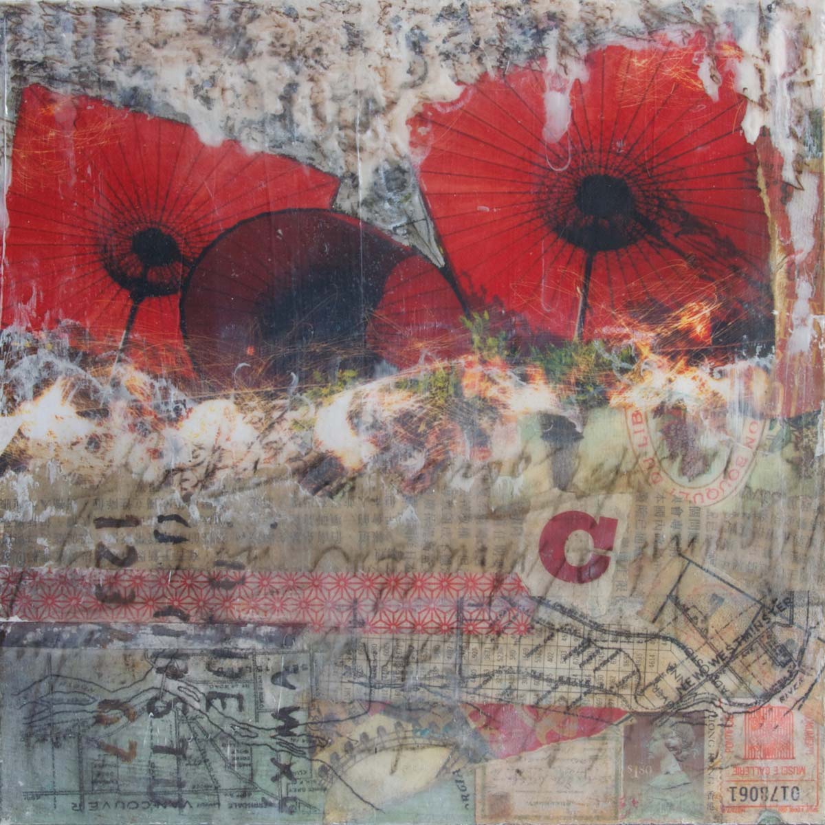 The photos in my paintings are often taken on casual walks through the city. The first photo is from traveling through the town of Sarlat, France and the second is from Granville Island in Vancouver. Embedded into both paintings are poem excerpts by Denise Levertov and of which inspired the painting titles. Measuring only 8” x 8”, these pieces allowed for small-scale collages and for the challenge to see what I could do in a short time frame.