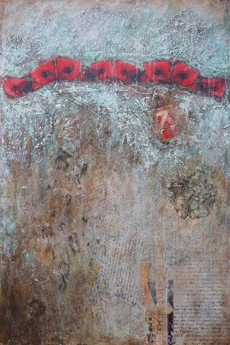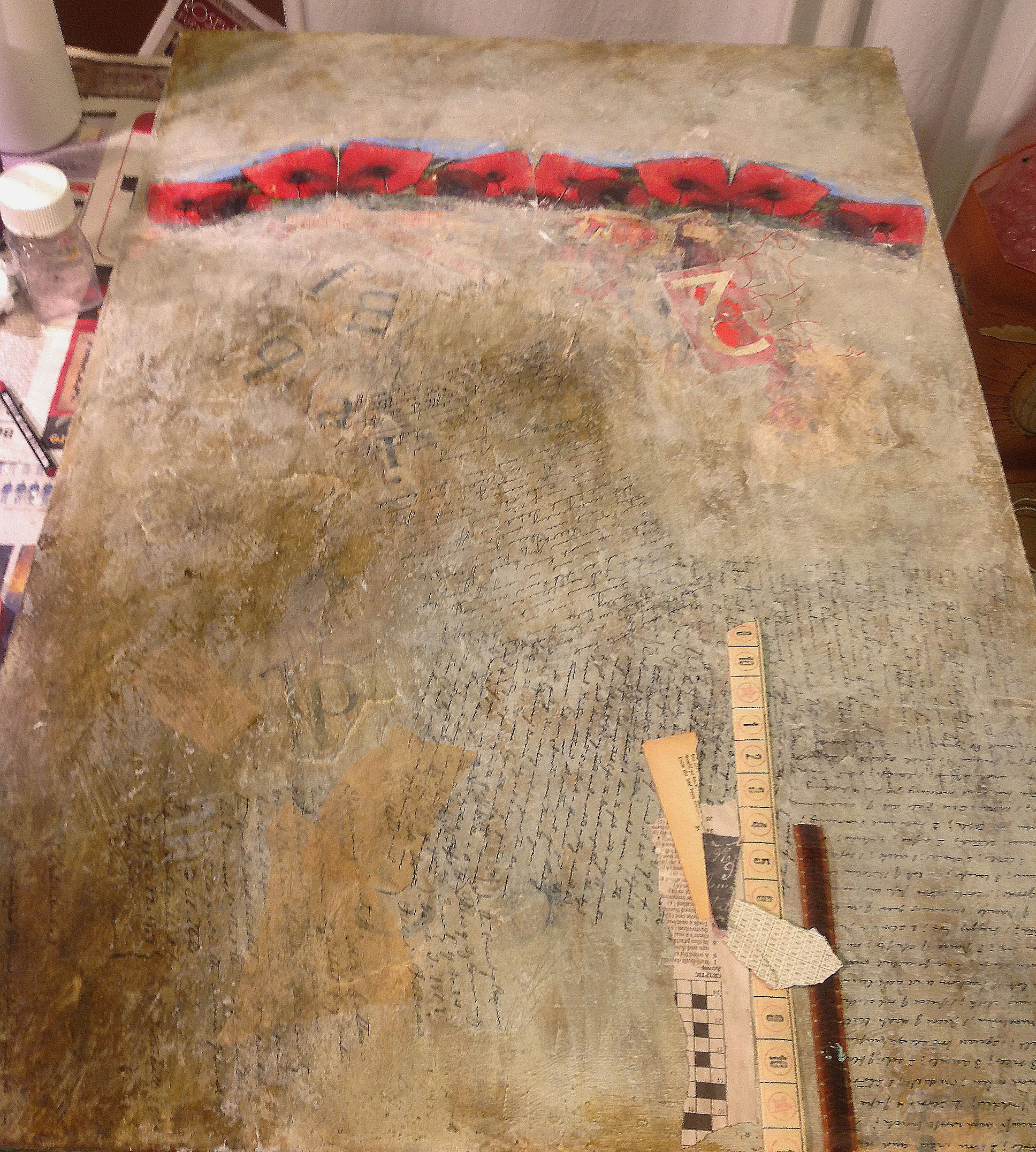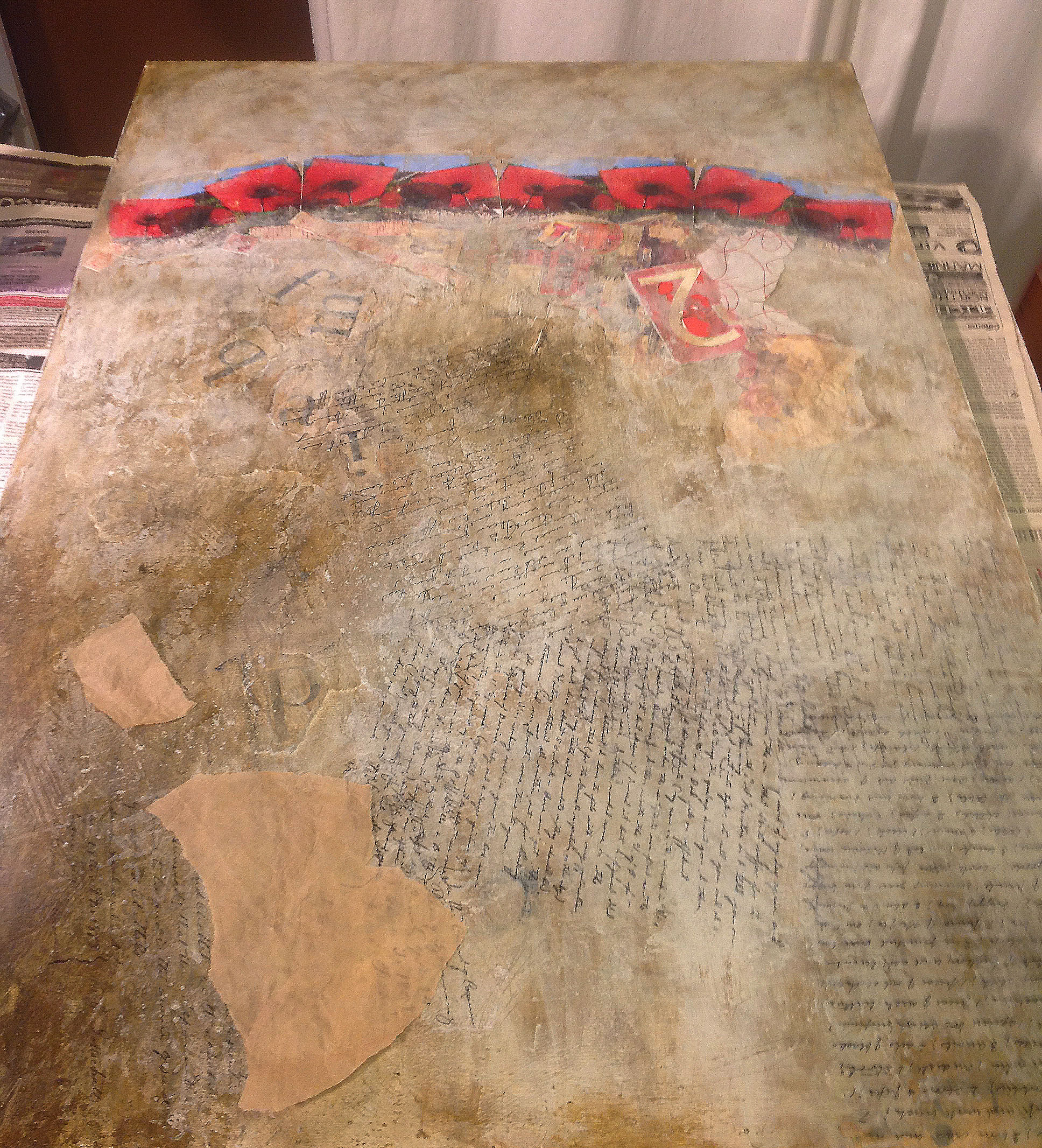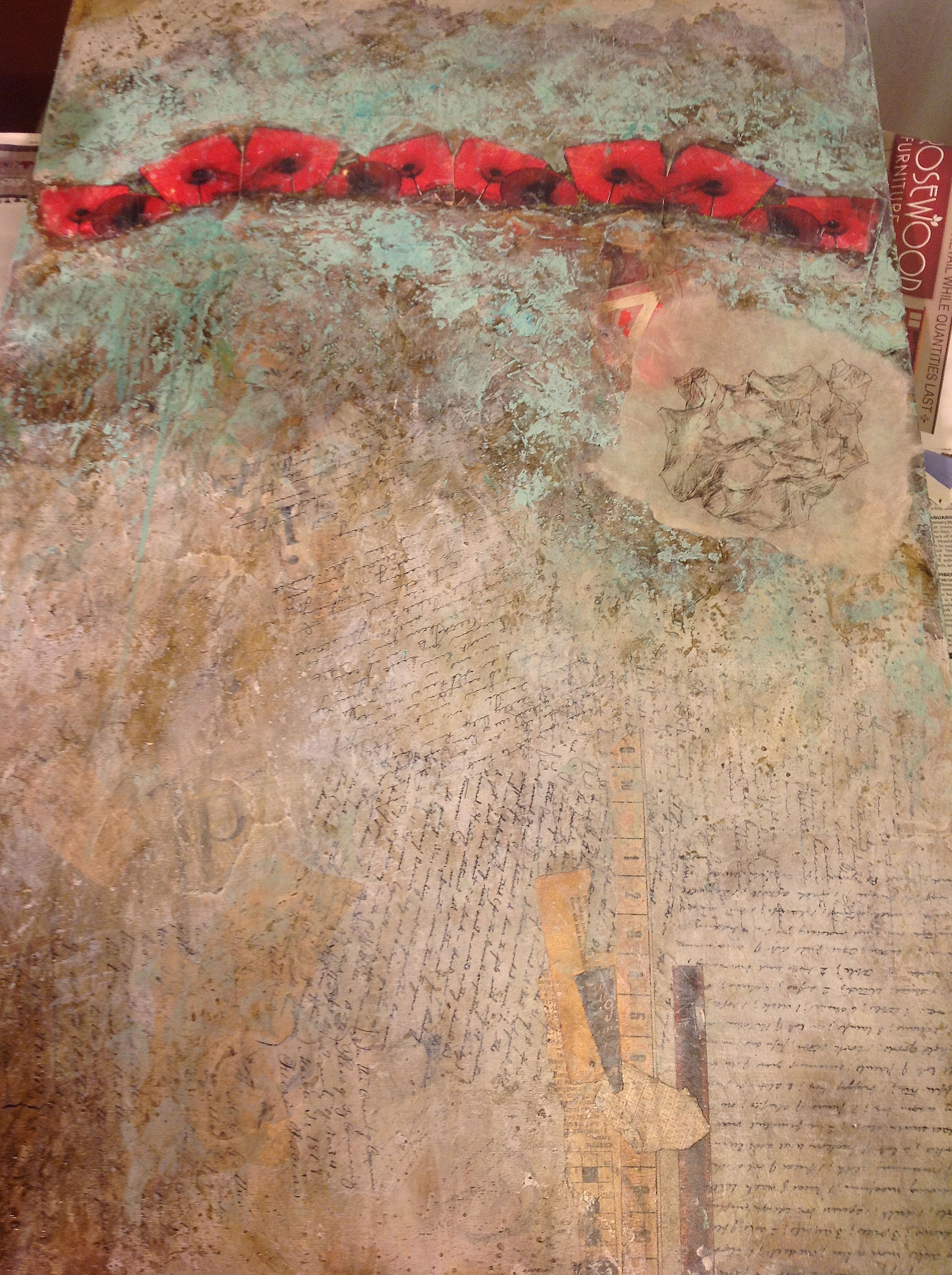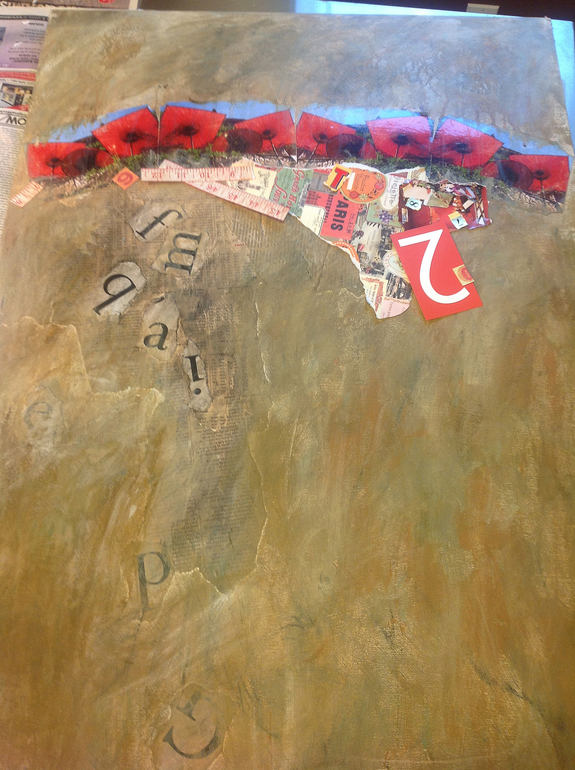 For this piece, I was inspired by the process of writing letters and wanted to also celebrate the elegance of text. When you start to write, your mind delves out a flow of ideas that take shape as you rearrange your “mental furniture”. Layering together letter excerpts and drips of paint suggests the idea of moving thoughts. They have a life of their own, running down a page and puddling together to create a passage. The letters were from a married couple separated during World War II. Writing can reveal more vulnerability than in spoken conversation. I imagined that for this couple, writing was a way to cope and share the life that the other that was missing. For that reason, every sentence would be special and meaningful. Nothing would be mundane.