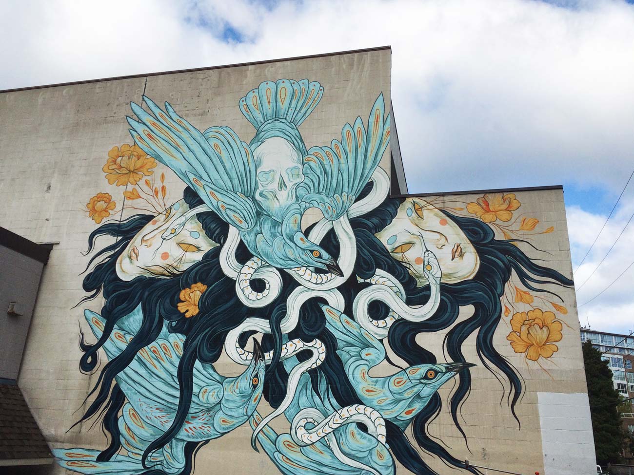 What has been long overdue for this city is an injection of energy with public art! Lots of new murals have gone up this summer for the Vancouver Mural Festival. These murals are really exceptional and they can be enjoyed by everyone, everyday. I really like the range of artists that were chosen and I hope that this the start of something more to come. You can also check out some of the art by the participating artists at a Vancouver Mural Festival: Year One group exhibit at Burrard Arts Foundation on until August 27th.