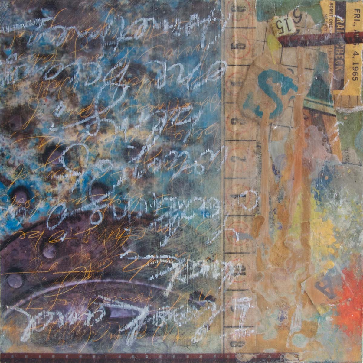 The photos in my paintings are often taken on casual walks through the city. The first photo is from traveling through the town of Sarlat, France and the second is from Granville Island in Vancouver. Embedded into both paintings are poem excerpts by Denise Levertov and of which inspired the painting titles. Measuring only 8” x 8”, these pieces allowed for small-scale collages and for the challenge to see what I could do in a short time frame.