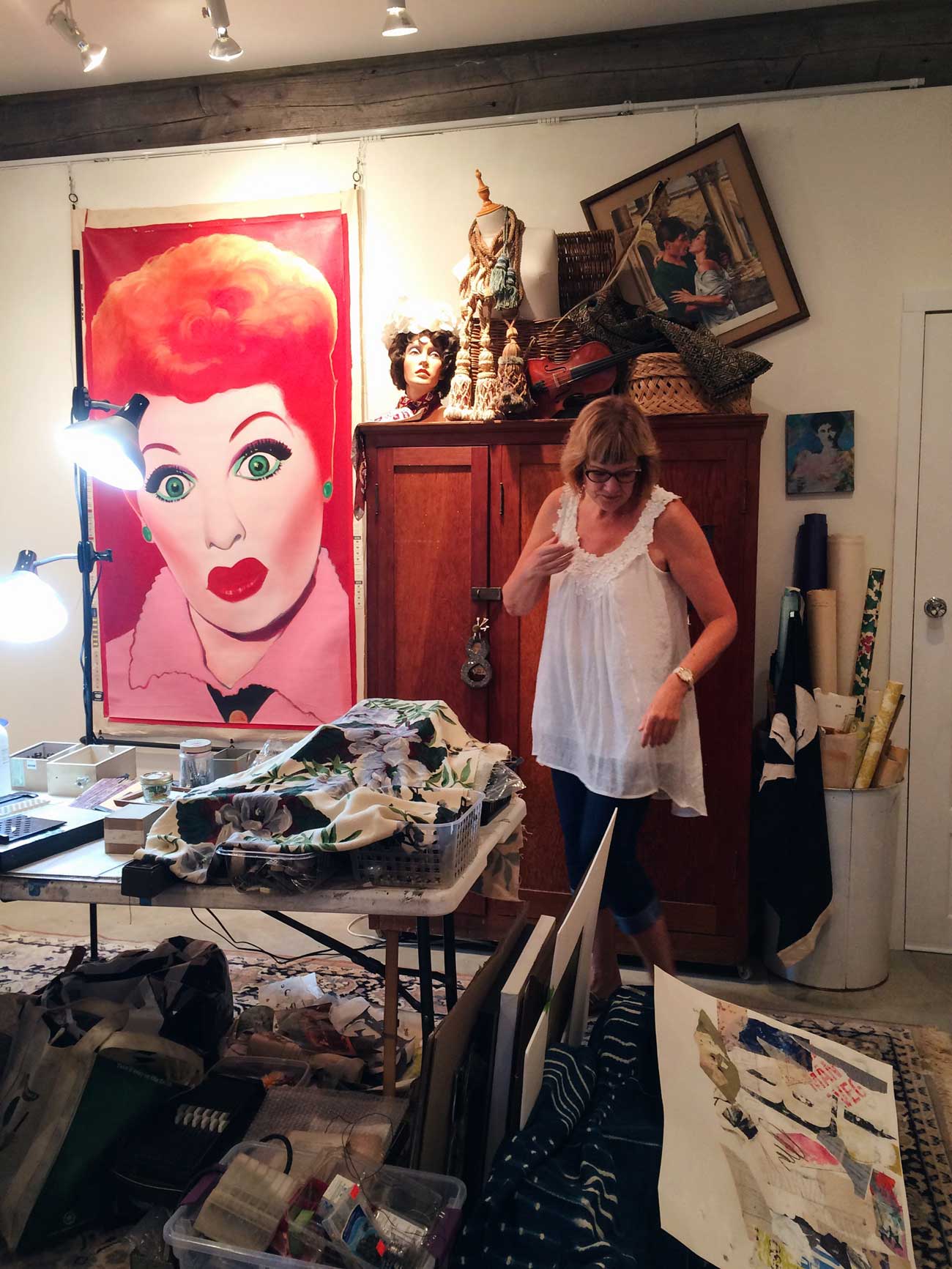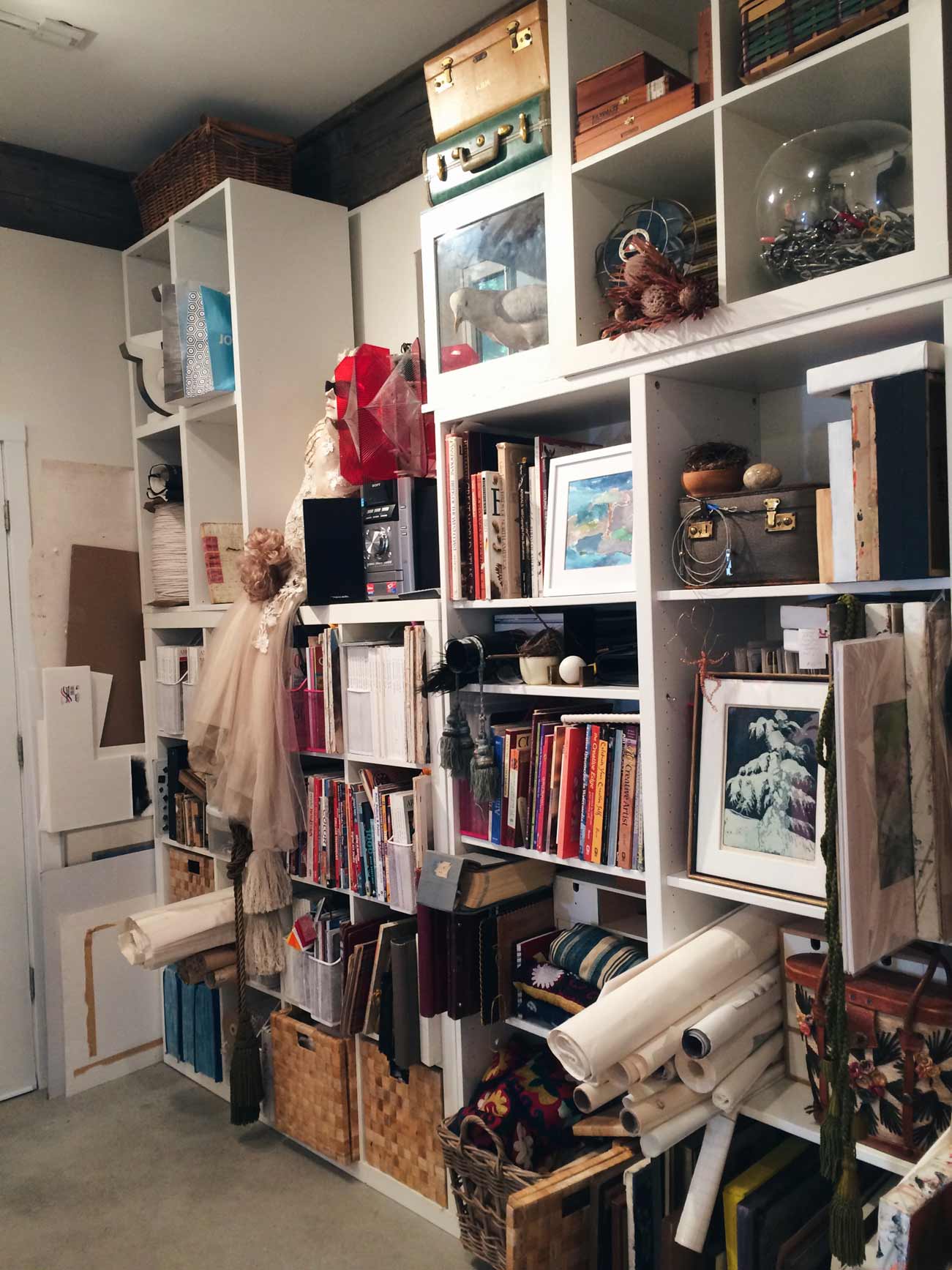 On this field trip, we were also hoping to visit with some other local artists. One person I thought of was Ginny Vail, who I had stumbled upon a while ago on Instagram. I had previously known of her through regularly visiting her retail store Swallow’s Nest over the years before it closed. She had a great eye for collecting salvaged and vintage furniture. At the same time I noticed her handmade paper collages. On a whim I contacted her to see if she was willing to give us a studio tour. Lucky for us she agreed! She was so kind and generous with her time to show us her work and her incredible studio. It is a space that you could easily get inspired in. Every corner had wonderfully arranged vignettes with objects full of texture and history. My favourite pieces are the ones she painted in workshop with artist Nicholas Wilton, which are the 2 small pieces pictured at the far left in the photo below. It would be incredible to learn from Nicholas Wilton one day. I loved Ginny’s enthusiasm and was so grateful that she was able to share her creative process with us.